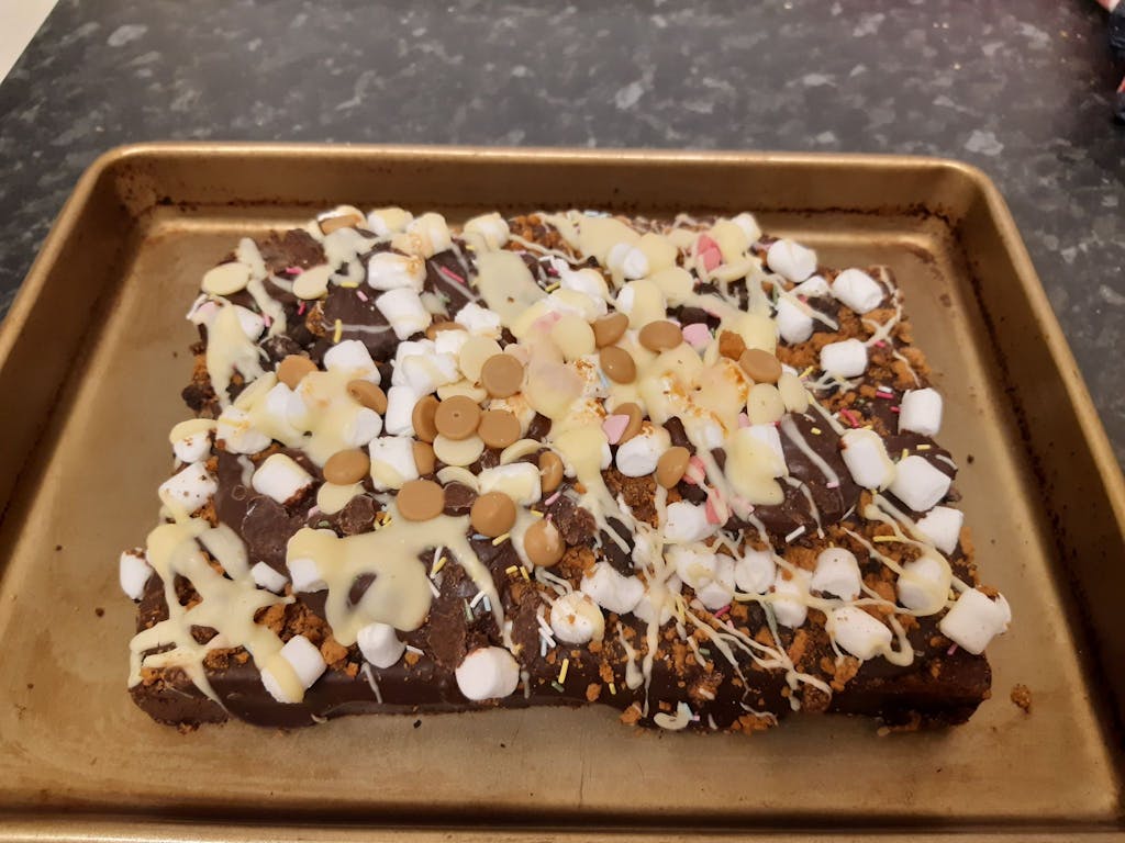 Our wonderful brownie mix, baked then topped with marshmallows, cookies and chocolate buttons, drizzled with more chocolate.