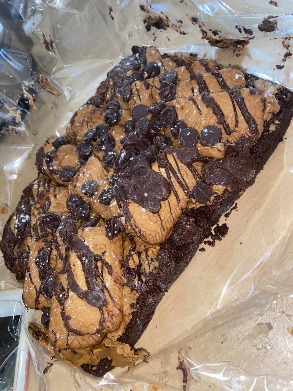 Our famous luscious dark chocolate brownie as a slab equivalent to 14 regular brownies, topped with Biscoff™️ spread, Biscoff™️ Chocolate Biscuit, Dark Chocolate Chips, & Yorkshire Tea ™️ Caramel Syrup.